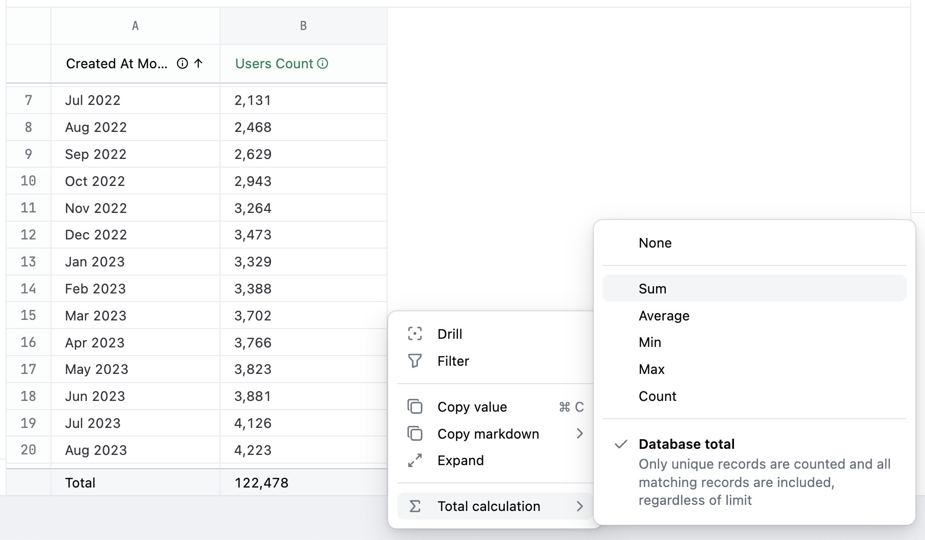 In cases where you’re looking to actually sum these values and make them non-distinct (which we see relatively rarely), hover over the 3 dot menu on the right side of the cell of the total you’d like to change, and you can swap to a naive total.